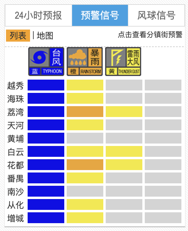 据@广州天气信息,目前荔湾、越秀、白云及花都的西侧等地雨势正在加强,暴雨预警生效中,请大家注意防御,最好就先别出门。截至13:40,广州台风+暴雨+雷雨大风三预警齐发,11区台风蓝色预警生效中,荔湾、白云、花都雷雨大风黄色预警生效,除黄埔、南沙外,各区暴雨预警生效中。